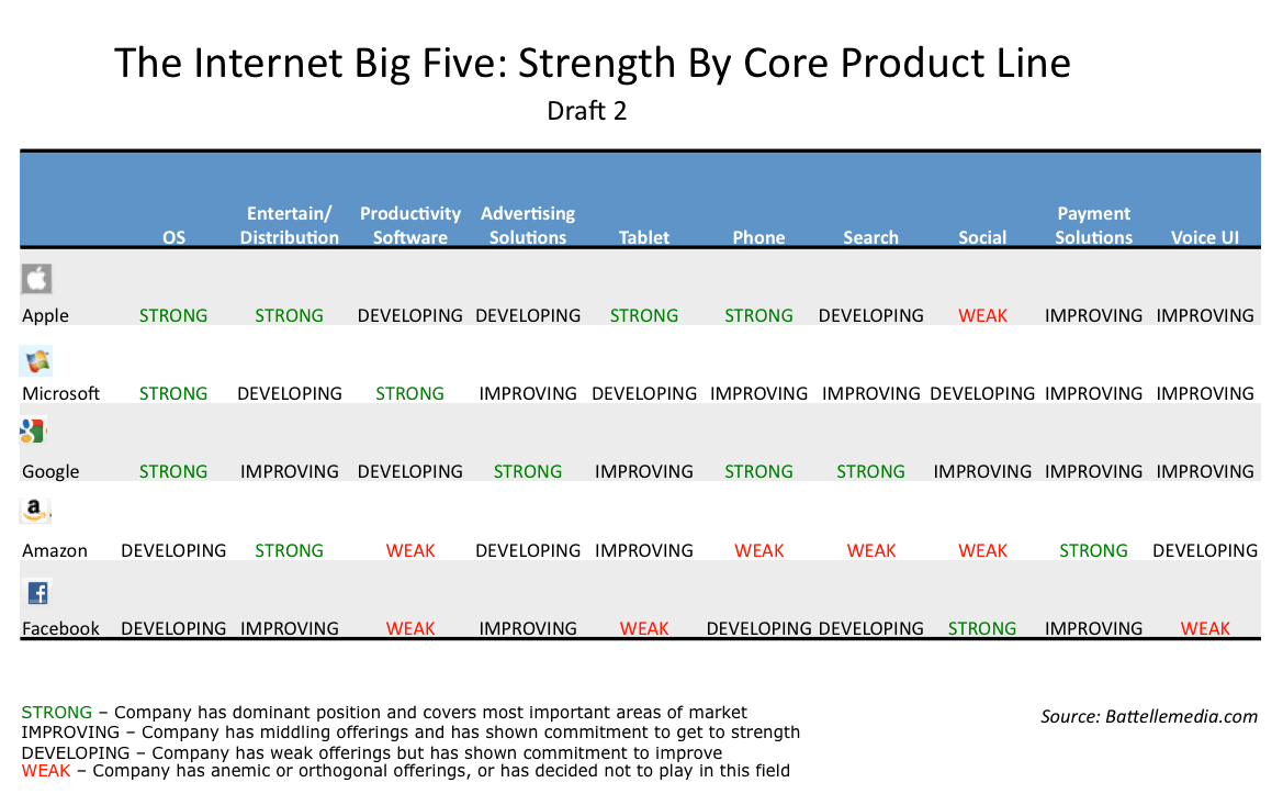 This one focuses on core product lines where all (or most) of these companies are playing. For me, these product lines, taken together, are the basis of what we might call “the operating system of our lives.” And since the book is about how we will be leveraging our lives over digital platforms in one generation, it struck me as important to assess where each of the Big Five is right now (what they have already built) and where they are weak (what they need to build to compete).